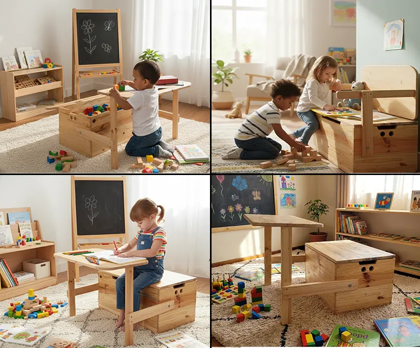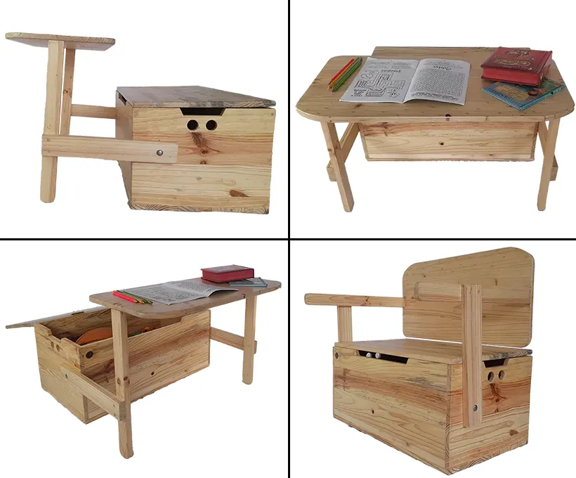 Novedoso y super practico 3 en 1, este banco de diseño único ya que en un solo paso la puedes convertir a escritorio o bien en cajón que harán mas fáciles y felices los dias de tus peques a la hora de jugar o estudiar.